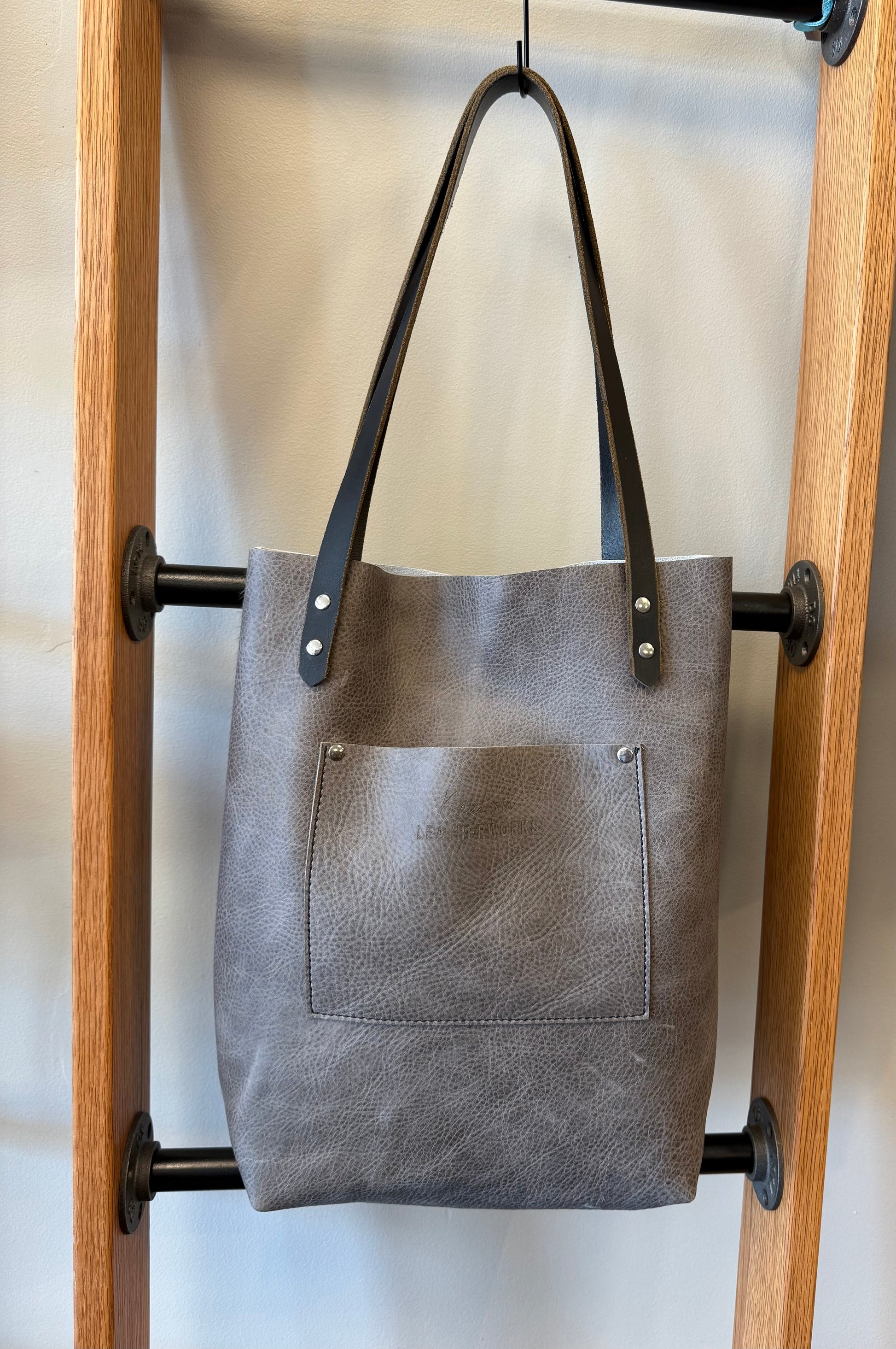 Silver and white HOH down the center cowhide front and grey Leather back. One back pocket.